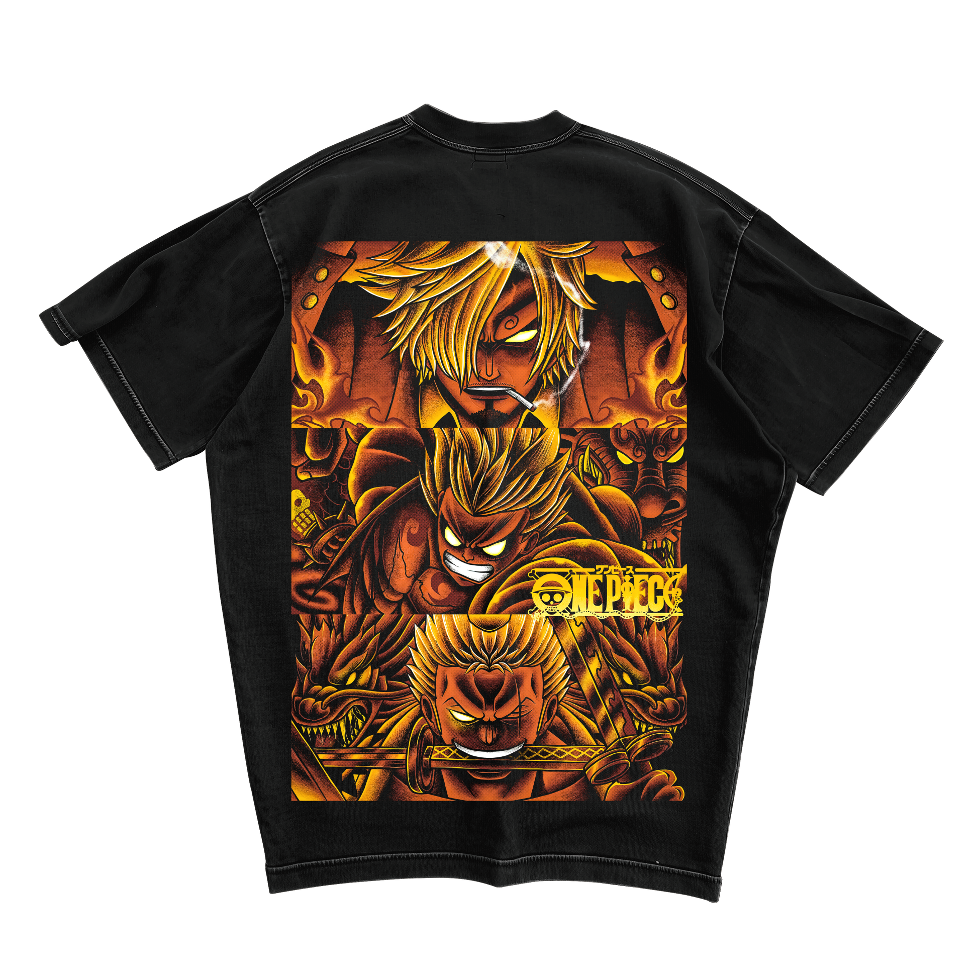Unleash the power of the Straw Hat Pirates’ Monster Trio with this striking One Piece oversized tee. Featuring Luffy, Zoro, and Sanji in a fierce, flame-charged artwork, this design captures their unstoppable energy and brotherhood in one bold statement piece.