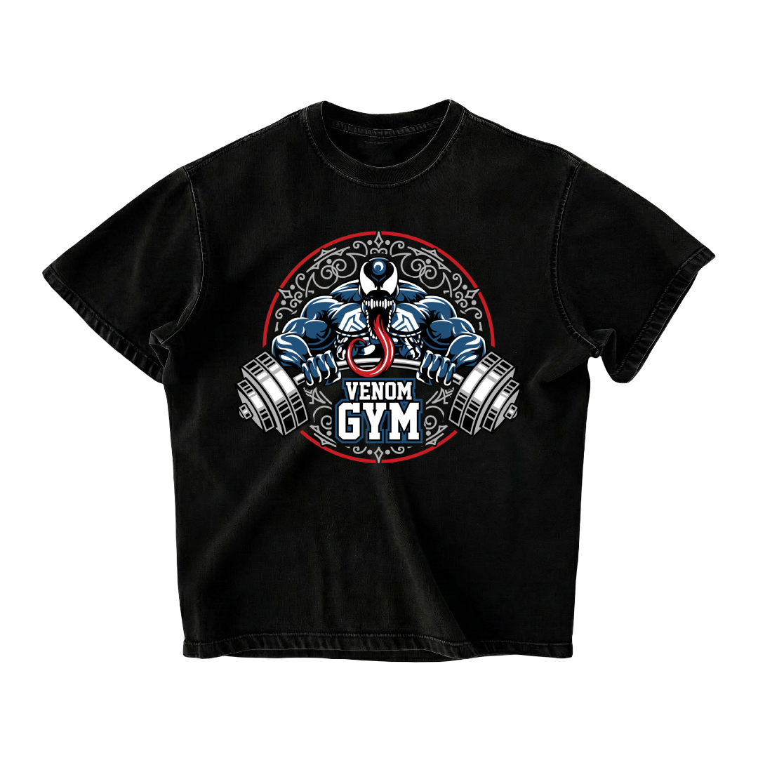 The back showcases a fierce Venom artwork with neon-green splatter effects and aggressive detailing, bringing the character’s wild, unstoppable nature to life. The front features the bold Venom Gym emblem, showing Venom gripping heavy dumbbells — a perfect fusion of superhero intensity and gym culture.